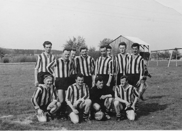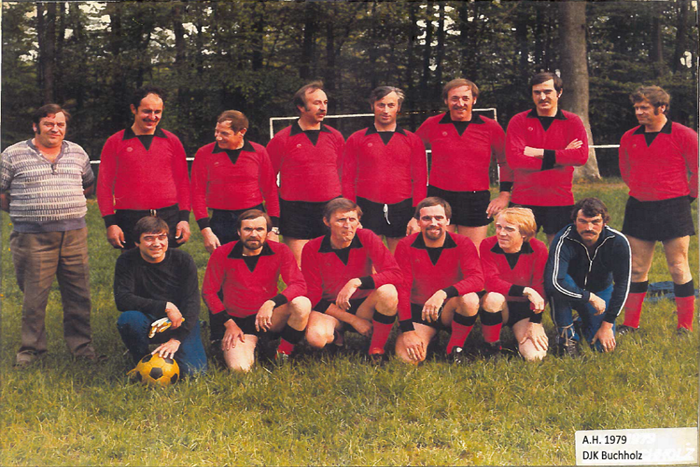 1962: Alte Herren und erste Mannschaft: von links nach rechts: Peter Schmitz, Willi Schmitz, Rudolf Thullen, Bernhard Stolz, Josef Lamberty, Gerhard Klaus, Rudolf Schmitz, Albert Weber, Josef Weber, Josef Steffens (Heede-Jipp), Johann Stolz, Alfred Schmitz, Wilfried Vasel, Johann Thullen, Peter Stolz II (Letschaalen), Albert Schmitz, Peter Stolz, Philip Schmitz, Alois Stolz, Willi KollerDJK Buchholz